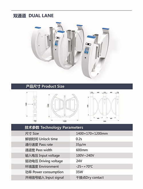 R3012 1.尺寸: 1400x170x1200mm 2.解鎖時(shí)間: 0.2s 3.通行速度: 35p/m 4.通道寬: 600mm 5.輸入電壓: 100v~240v 6.驅(qū)動(dòng)電壓: 24v 7.環(huán)境溫度: -25~+70℃ 8.功率: 35w 9.開(kāi)閘信號(hào)輸入: 干接點(diǎn) 10.產(chǎn)品包裝: 紙箱+珍珠棉 11.產(chǎn)品型號(hào): R3012