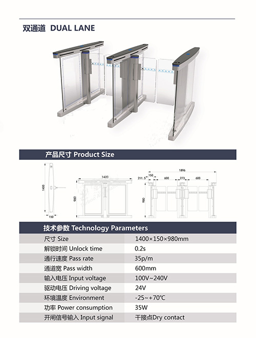 1.速通門B323A系統(tǒng)具備防撞功能,當(dāng)有外物在未授權(quán)的狀態(tài)下撞擊擺桿,擺桿運(yùn)動(dòng)角度達(dá)到菜單設(shè)定的值(如 2°),控制器_會(huì)啟動(dòng)剎車機(jī)構(gòu),阻止擺桿運(yùn)動(dòng),并啟動(dòng)聲光報(bào)警。當(dāng)外力進(jìn)一步增大,剎車控制器會(huì)保護(hù)擺桿不被撞斷,外力撤除后,擺桿自動(dòng)歸位,系統(tǒng)正常; 2.速通門B323A系統(tǒng)具備角度分辨和零位自檢功能,包含 500P/R 編碼器,分辨精度高,這種高精度的傳感器的優(yōu)勢(shì)是使擺桿轉(zhuǎn)動(dòng)_; 3.非法進(jìn)入有報(bào)警提示功能; 4.防沖功能,在沒(méi)有接收功能開(kāi)閘信號(hào),擺臂自動(dòng)鎖死; 5.紅外防夾功能,在擺臂復(fù)位的過(guò)程中紅外檢測(cè)到人在通道中,擺臂會(huì)自動(dòng)回到打開(kāi)狀態(tài); 6.速通門B323A統(tǒng)一標(biāo)準(zhǔn)的對(duì)外電氣接口,可與多種讀卡器相掛接,并可通過(guò)管理計(jì)算機(jī)實(shí)現(xiàn)遠(yuǎn)程控制與管理; 7.系統(tǒng)設(shè)有過(guò)流保護(hù)裝置,當(dāng)負(fù)載_過(guò)某設(shè)定值(如 2._),系統(tǒng)停止工作,以免燒壞電機(jī)等設(shè)備;
